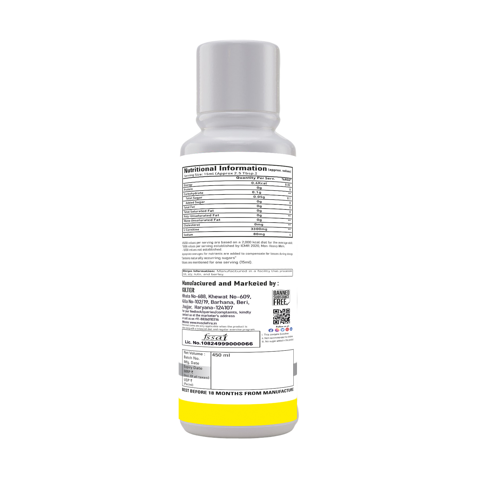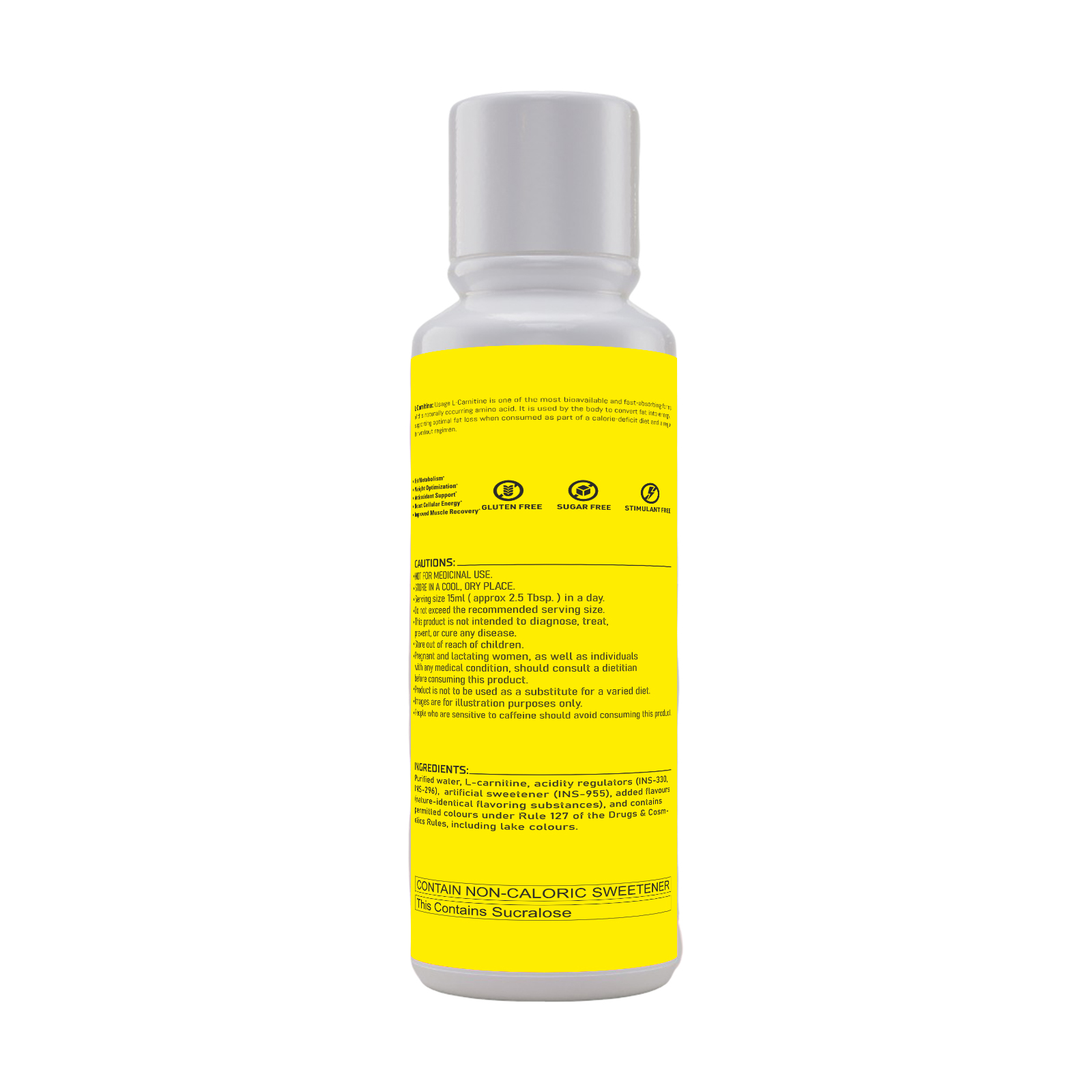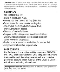The “Nutritional Information” panel reveals a low-calorie content, with approximately 0.46 kcal per 15ml serving. It contains minimal carbohydrates (0.11g) and no added sugars, total fat, saturated fat, or trans fat. The primary active ingredient is L-Carnitine (1500mg per serving). Other ingredients include purified water, acidity regulators (INS-330 & INS-296), natural and nature-identical flavoring substances, and colors. The product contains non-caloric sweetener, specifically Sucralose.